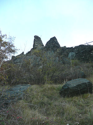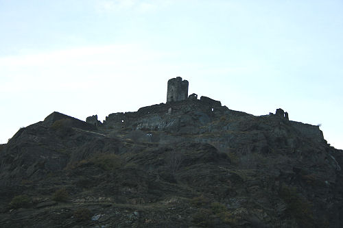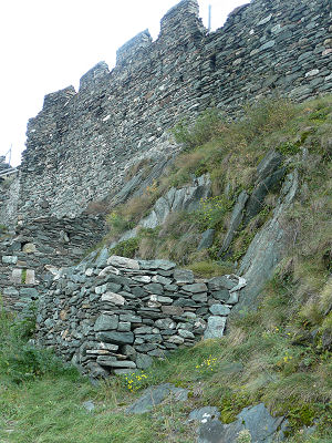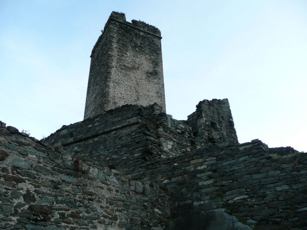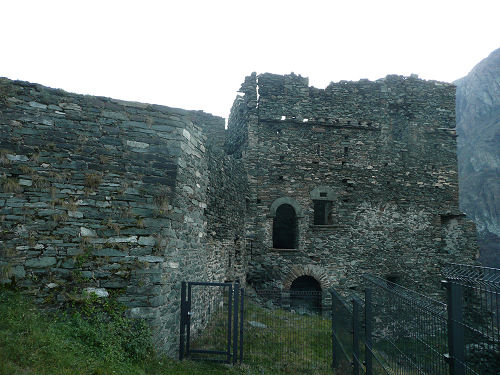 L’entrée se fait à l’Est par une ouverture dans le mur d’enceinte. L’entrée du château donne accès à une petite cour, une sorte d’avant-porte par laquelle on accède à une vaste enceinte allongée. Enceinte qui comprend deux longs bastions du XVIème siècle et au Sud, deux corps de bâtiments adossés contre cette enceinte. Ces bâtiments servirent de résidence aux Challant et aux propriétaires suivants.