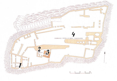 Plan du château de Saint-Germain: 1: bâtiments d'habitation, 2: citerne, 3: tour carrée, 4: installation militaire de l'époque de la Renaissance